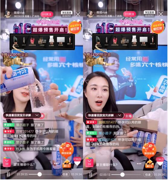 另一場,在5月24日的淘寶一姐薇婭和六個核桃的合作直播,更是盛況空前。