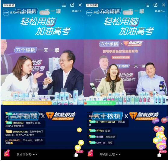 六個核桃直播時產品與營銷的雙向創(chuàng)新,也贏得實實在在的支持,在短短1個小時內僅僅京東平臺就吸引超125萬人觀看。對于那些真正有購買產品計劃的人群來說,進直播間能夠搶到前所未有的超級折扣優(yōu)惠,企業(yè)真誠讓利于消費者;對于暫無購買計劃的人而言,開心圍觀頂流大咖跨界直播、測試幸運手氣同時,也收獲到更多與健康相關的理念和知識,并為高考生加油助力。