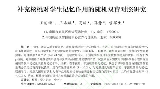 2018年,中國疾控中心營養(yǎng)與健康所中心實驗室通過人體試食試驗結(jié)果表明:受試者連續(xù)服用核桃乳飲品(由養(yǎng)元飲品六個核桃提供)30天后,試食組的指向記憶、圖像自由回憶以及人像特點聯(lián)想回憶三項分測驗量表分及記憶商高于試驗前。由此可見,核桃乳具有輔助改善記憶的功能。因此科學(xué)家們得出“核桃植物蛋白飲料具有輔助改善記憶功能的作用”的重要結(jié)論,之后該項研究更被學(xué)術(shù)期刊刊登。