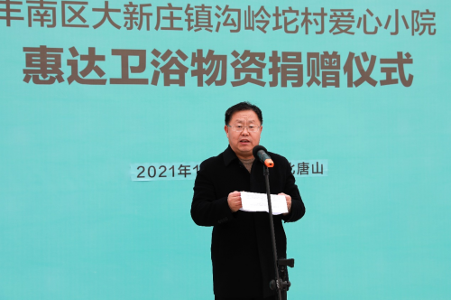 捐贈儀式由唐山市豐南區(qū)人大選任代工委主任溫進峰主持,她說:“郭俊章同志作為大新莊鎮(zhèn)溝嶺坨村走出來的知名企業(yè)家,他致富不忘鄉(xiāng)親,是區(qū)人大常委會開展?fàn)巹?chuàng)履職作用好、崗位業(yè)績好、社會形象好“三個好”代表的先進典型。王佳同志秉承著惠達(dá)衛(wèi)浴‘恩澤一地,惠達(dá)八方’的經(jīng)營理念,致富百姓,造福一方經(jīng)濟做出了巨大的貢獻(xiàn)。舉行物資捐贈儀式,主要是弘揚社會正能量,展示爭創(chuàng)‘三個好’人大代表活動的豐碩成果。”