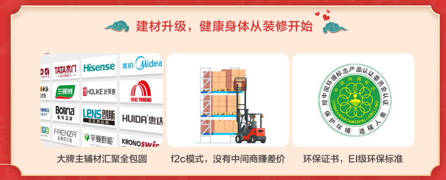 第三重升級:建材升級,一線品牌保品質(zhì)更保安全。全包圓直面家裝消費者最關(guān)心的“用材”問題,主輔材所選品牌均為一線,采用F2C工廠直采方式,無中間商賺差價,可以最優(yōu)惠的價格供應(yīng)消費者,拉低整體家裝成本。同時,一線品牌均符合國家環(huán)保標準,在實現(xiàn)裝修高品質(zhì)的同時,也能最大化保障業(yè)主的身體健康。