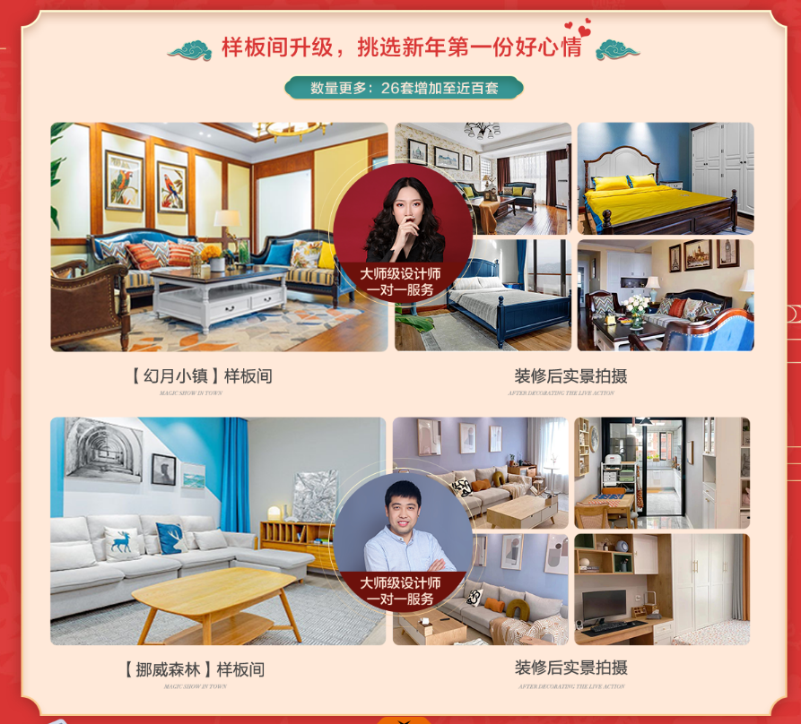 第二重升級:樣板間升級,選擇更多樣。全包圓大手筆將26套精品樣板間在虎年伊始一口氣提升為百套,中式、北歐、歐式、美式、新中式、簡美、現(xiàn)代簡約、輕奢、日式……各種流行風(fēng)格應(yīng)有盡有,數(shù)量多又不繁雜,使消費者能分門別類更有條理地甄選所愛。同時,高級別設(shè)計師一對一服務(wù)針對性再設(shè)計,更使打造完美愛居計劃錦上添花。