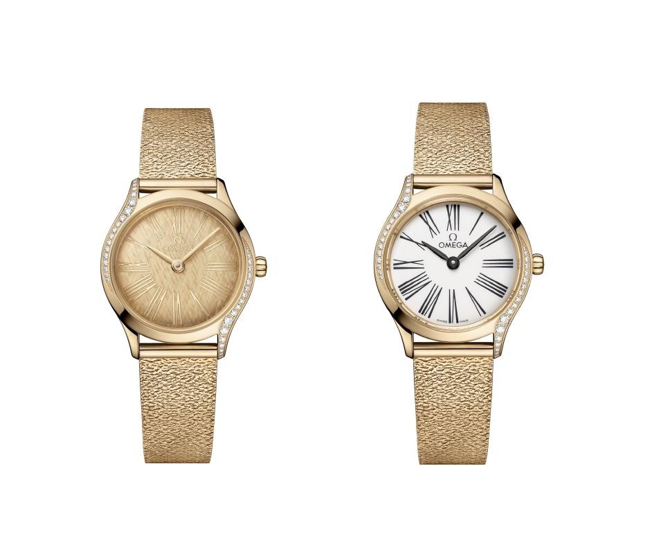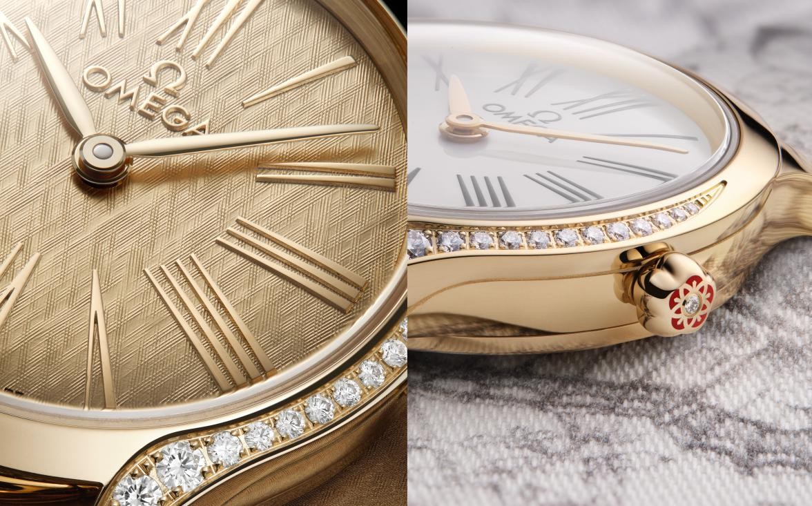 全新名典腕表包含兩款由Moonshine 18K金打造的腕表,閃耀迷人。其中一款腕表的表殼、表鏈、指針、小時刻度甚至飾有絲綢紋理的表盤均由歐米茄獨(dú)家研發(fā)的Moonshine 18K金制成,渾然一體。另一款則搭配由“大明火”工藝制成的米白色琺瑯表盤,飾以經(jīng)黑化處理的羅馬數(shù)字刻度,對比鮮明。