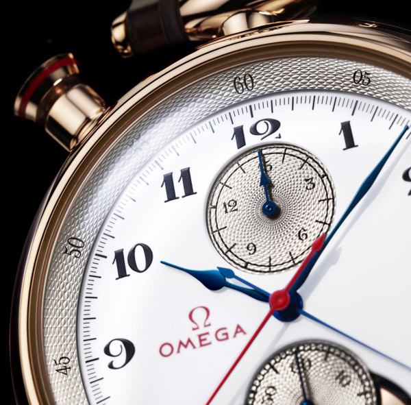 表盤上的中央時(shí)針和分針均采用Sedna 18K金材質(zhì)打造而成,經(jīng)藍(lán)色PVD處理,6點(diǎn)位設(shè)有小秒盤,12點(diǎn)位設(shè)有15分鐘計(jì)時(shí)盤,小表盤中的指針亦采用Sedna 18K金材質(zhì)制成,并經(jīng)藍(lán)色PVD處理。中央計(jì)時(shí)秒針覆以藍(lán)色CVD涂層,計(jì)時(shí)追針則經(jīng)紅色漆面處理,以便清晰讀取計(jì)時(shí)時(shí)間。黑色阿拉伯?dāng)?shù)字刻度和“軌道式”分鐘圈則采用“小明火”琺瑯工藝燒制而成,用以致敬1932年歐米茄于洛杉磯奧運(yùn)會(huì)使用的計(jì)時(shí)懷表。