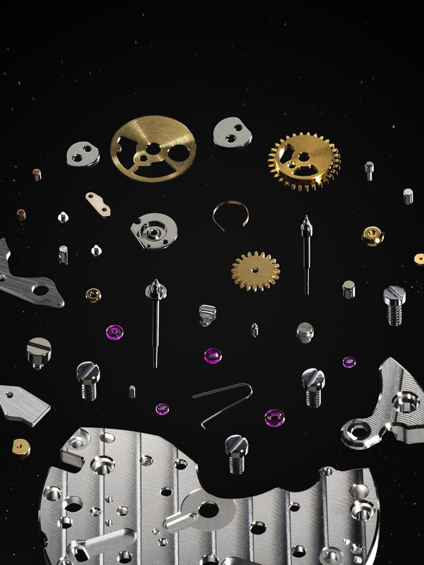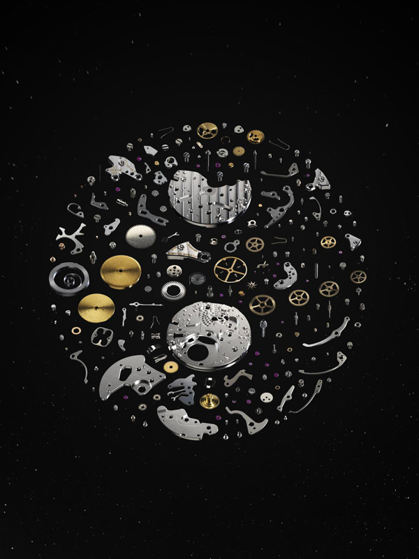 在這組分解圖中,歐米茄3861同軸至臻天文臺(tái)機(jī)芯的精密零部件被置于三種不同的背景中,每個(gè)背景都旨在呼應(yīng)歐米茄品牌歷史中的重要篇章:太空探索、精準(zhǔn)性能和創(chuàng)新精神。