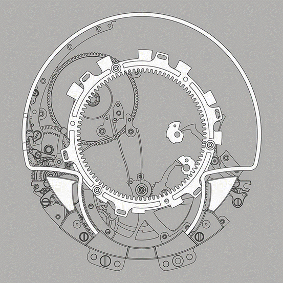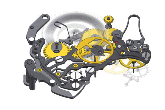 另一方面在于計(jì)時輪系的動態(tài)屬性,我們知道,計(jì)時需由杠桿將計(jì)時輪壓向走時輪,嚙合后啟動。要在動態(tài)的計(jì)時輪系上添加時間記憶蝸形輪,并能與讀時系統(tǒng)完美嚙合,對各功能的精準(zhǔn)度提出了新要求。
