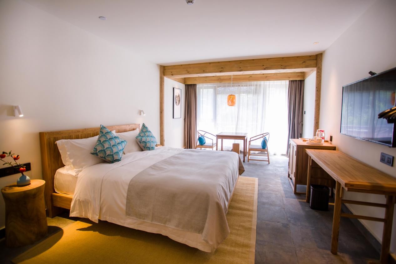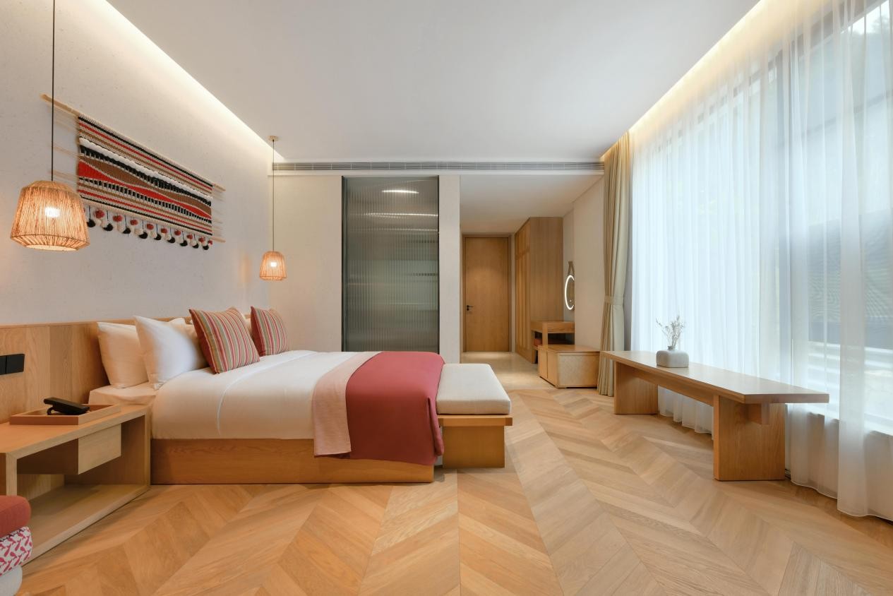 霧,是九華山最常見的天氣現(xiàn)象之一。在這里,雨、霧、云交繪之下造就了五彩奇幻的飄渺仙境。九華山陌上花間堂·霧澗是安徽首家花間堂,坐落于九華山西麓,八都河上游。酒店以「星空下的圖書館」為靈感始點,從色、聲、味、形四大主體出發(fā),每個主體都像是一個自然原生態(tài)的圖書庫,讓旅人靜下心來悠游自然書海,細品花間堂的專屬韻味。走進大堂,壯觀的圖書墻映入眼眸,右手邊的迎客松早已精神抖擻地歡迎旅人的歸來。枯山水、青陽腔色調(diào)的堂內(nèi)休息區(qū),瞬間把人拉回到了舊時光。陽光透過層層竹林灑在落地窗前,照亮了花間水吧,找個靠窗角落小憩,有書、有畫、有貓、有咖啡,也有生活和治愈。酒店共65間客房,每一間客房都隱匿于山林、竹林中,隨處可見的設(shè)計擺件兒,皆取材于山林,歸于自然。整體設(shè)計摒棄了華麗感,以木材、石頭、編織為主,融入環(huán)境綠意,處處都是低調(diào)謙遜的自然氣息。特別推薦親子度假、自然人文探索與攜寵出行客群前往體驗。