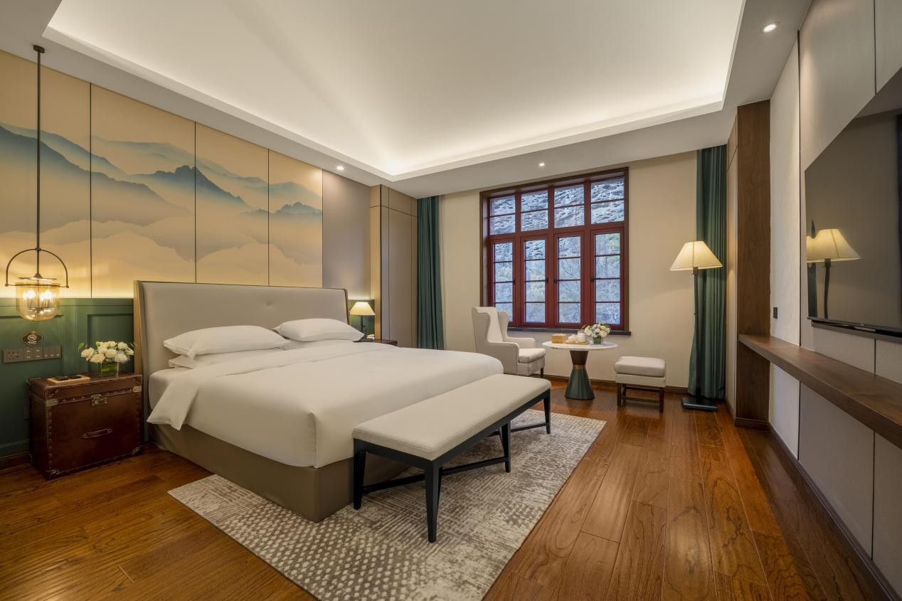 甫開業(yè)的上饒龜峰花間嶺·碧水丹心,位于江西弋陽縣西南的信江畔的三清山、龍虎山與武夷山之間,典型的丹霞地貌受自然風化影響,境域山體主峰狀若一只只巨龜,因而得名龜峰。在知名國家5A景區(qū)龜峰山內(nèi),穿越名勝鎖春洞,豁然開朗忽見一片如畫風景映入眼簾,上饒龜峰花間嶺·碧水丹心就佇立其中。遠離城市的紛擾,絕佳地理位置讓此處一直以來便是療愈心靈的勝地,如今在象形獨具的奇山碧水間,結(jié)合濃厚人文歷史底蘊,上饒龜峰花間嶺·碧水丹心不僅是游覽千姿百態(tài)的龜形丹山的精品酒店,也是融合年代情懷與紅色主題的人文景點。湖水當前、背靠奇峰,依山傍湖的隱逸桃源里,酒店建筑本體由一座風情獨具民國風情紅磚樓構(gòu)成,外觀最大化保留了建筑的歷史韻味,中式傳統(tǒng)風格加入西洋元素點綴,仿若在大美景色中,一步步見證傳統(tǒng)走向現(xiàn)代,將經(jīng)典之美升華為適合當代愜意假期的品味之選。酒店有11種房型,其中大床9間,雙床6間,套房10間。客房內(nèi)部從設(shè)計從家具選擇到室內(nèi)裝飾,同樣處處講究,身處其中既有置身民國大戶人家的既視感,又蘊含著當代潮流的奢適氛圍。幾何瓷磚與老式木地板、隔扇門展現(xiàn)空間的寬敞與層次感,色彩對比鮮明的家具、裝飾藝術(shù)的彩色玻璃燈與花鳥國畫等藝術(shù)選品,則為房內(nèi)更添匠心巧思。特別推薦親子度假、自然人文探索與攜寵出行客群前往體驗。
