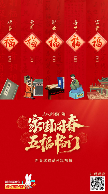 癸卯兔年新春佳節(jié)期間,劍南春挖掘五福內(nèi)涵及自身深厚的歷史文化底蘊(yùn),將唐宋元明清五個朝代的五位大家書寫的“福”字的內(nèi)涵,結(jié)合現(xiàn)代的福文化精神,向全國人民送去新年祝福,傳遞出“家國同春 五福臨門”的美好祝愿。串聯(lián)古今文化,連接五個維度幸福期盼,劍南春的走心祝福引發(fā)大眾共鳴,傳遞出濃濃的家國情懷!