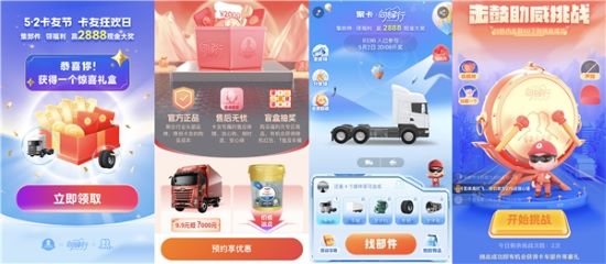卡友可進入“卡友地帶”APP,一起來挑戰(zhàn)“組卡車贏大獎”互動游戲,通過“黨的二十大學習”、“每日捐里程”等任務或者“擊鼓助威”小游戲收集卡車部件卡,最終組裝成完整的卡車,“駛?cè)?rdquo;線上主會場,參與52卡友節(jié)的最終大獎環(huán)節(jié)的抽獎。