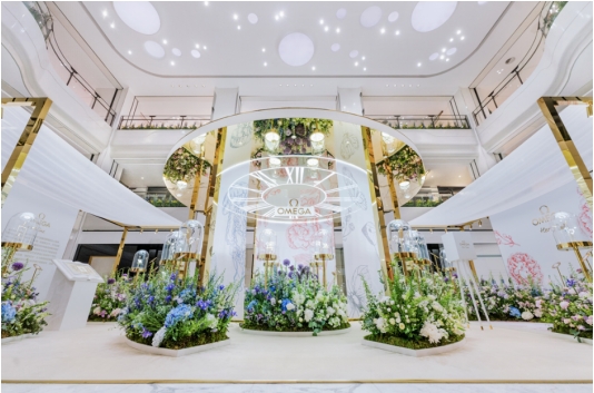 展覽采用白、金為主色調(diào),在充滿絢麗花朵的奇境花園中,呈現(xiàn)了星座、海馬、超霸與碟飛四大系列最新的女士腕表作品,以及歐米茄歷史上的女士時計代表作。