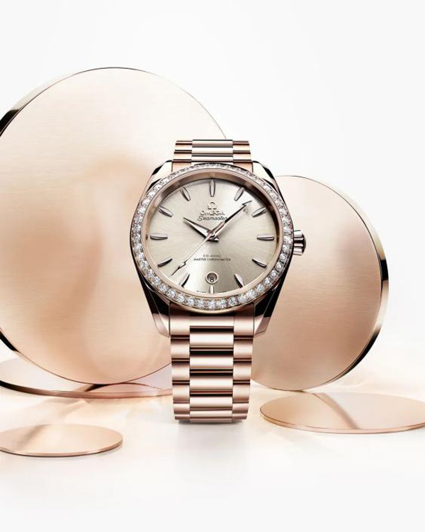 當(dāng)然,對(duì)于想要在基礎(chǔ)款式之上展露更多個(gè)人特色的女生來說,足夠特別才足夠令人喜歡。Aqua Terra Shades腕表有一款38毫米的全金腕表,采用歐米茄獨(dú)家研發(fā)的Sedna 18K金打造而成,這一獨(dú)特的紅色18K金色澤雅致,且不易褪色。表圈鑲飾46顆閃耀美鉆,共1.77克拉。砂巖色表盤經(jīng)CVD技術(shù)打造,呈現(xiàn)出太陽射線的打磨效果。