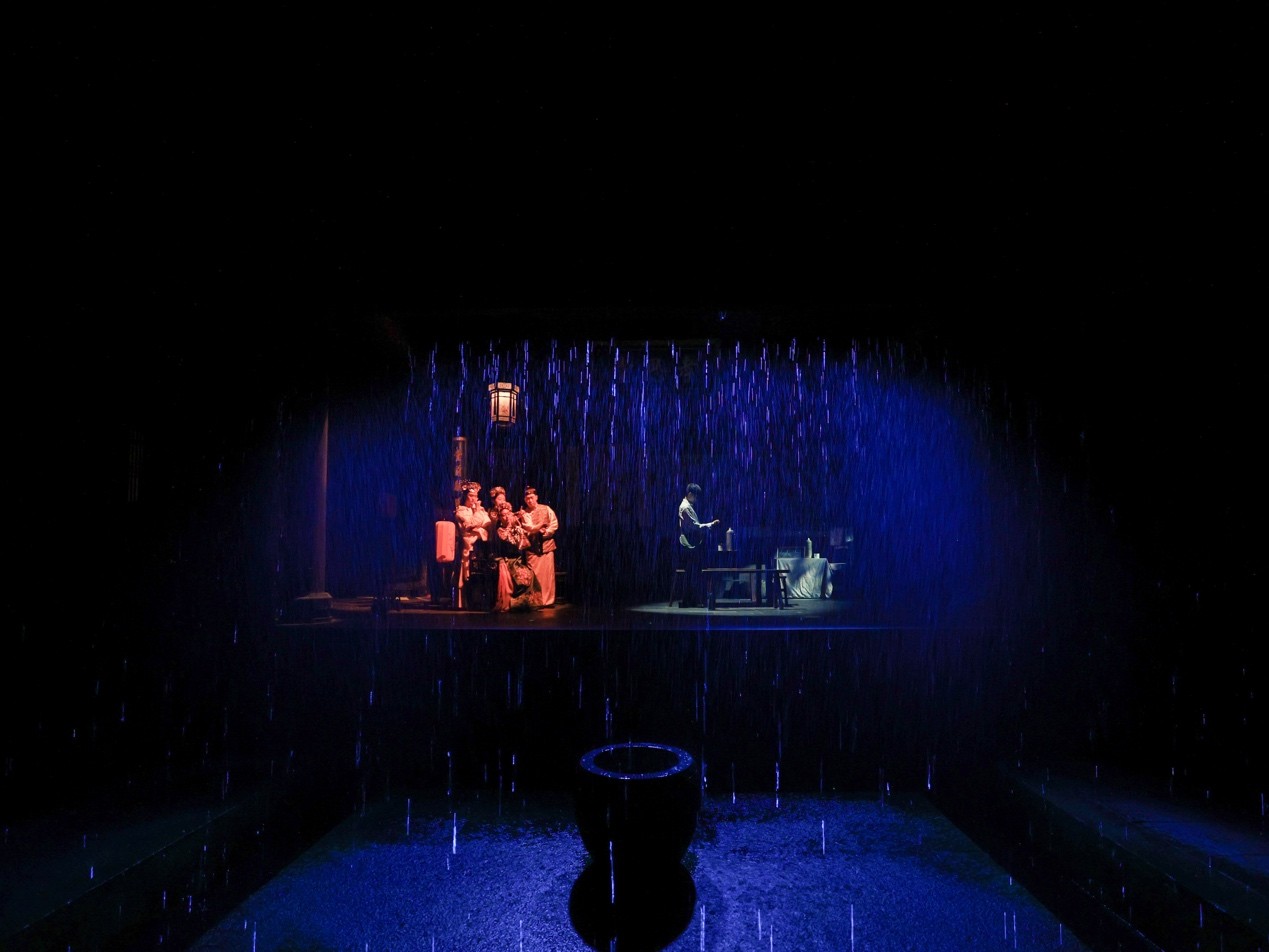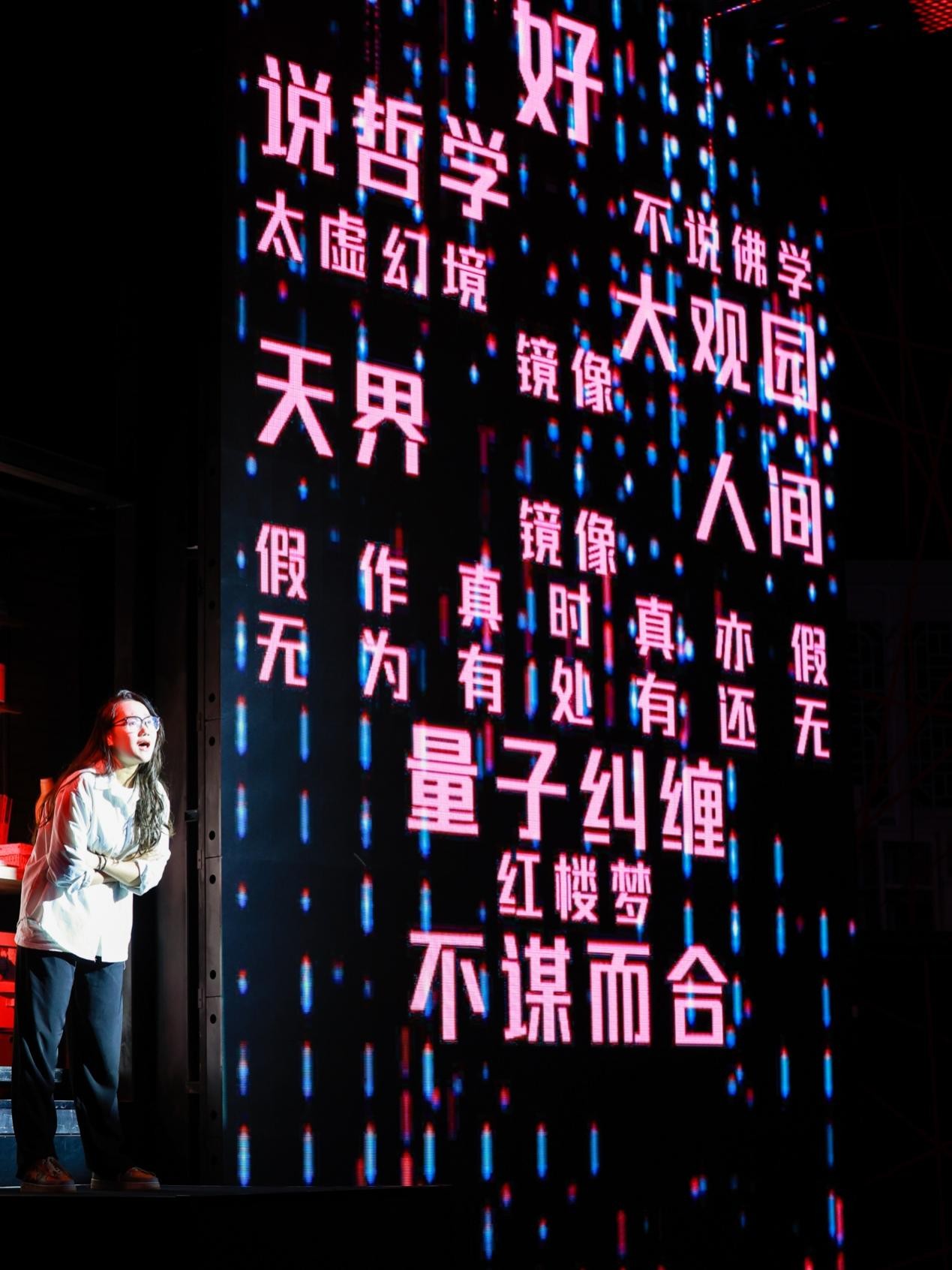 似乎又不完全是,巨大的環(huán)形劇場(chǎng)與升降舞臺(tái)、室內(nèi)水幕與雨霧場(chǎng)景、充滿(mǎn)禪意哲思的黑白空間,以及那把純紅的太師椅,坐在上面的人是在看書(shū)嗎?或許真如導(dǎo)演最初所言,這將是一座離讀者最近的城,也是唯一一座以讀者視角詮釋《紅樓夢(mèng)》的城,甚至妄圖將整個(gè)“紅樓世界”都裝入城中。