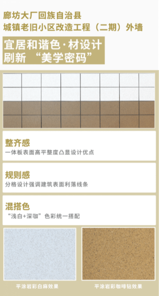 2022年,河北省廊坊大廠回族自治縣城鎮(zhèn)老舊小區(qū)改造工程(二期)正式啟動(dòng),重點(diǎn)改造2000年底前建成的老舊小區(qū),覆蓋居民3008戶。立邦為該工程整體外墻改造提供約10萬(wàn)㎡立邦節(jié)能裝飾一體板,并根據(jù)當(dāng)?shù)亟ㄖ?jié)能要求,選用60毫米EPS保溫芯材,同時(shí)采用帝彩石平涂巖彩飾面層分格設(shè)計(jì),配合“淺白+深咖”色彩效果,更好展現(xiàn)出石藝外墻的豪華厚重質(zhì)感。