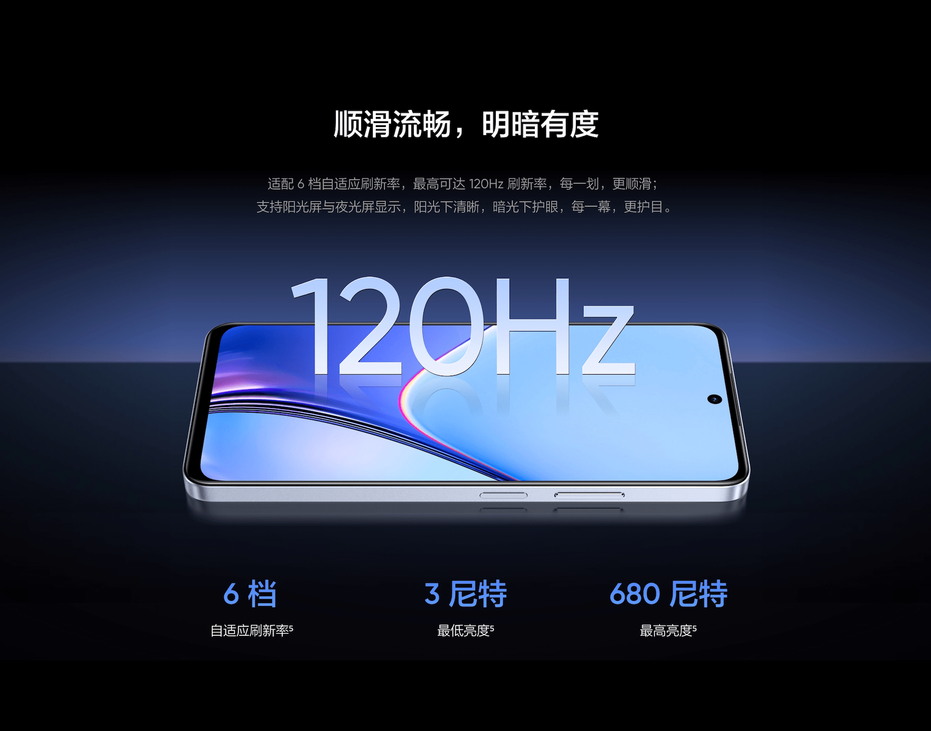除了日常的流暢體驗(yàn)以外,屏幕方面更高清的色彩呈現(xiàn)以及護(hù)眼效果,也直接影響著用戶(hù)的使用體驗(yàn)。真我V50系列正面配備了一塊6.72英寸的高清護(hù)眼屏,支持120Hz高刷與6檔自適應(yīng)刷新率,畫(huà)面流暢細(xì)膩;最高亮度為680nit,還有陽(yáng)光屏與夜光屏顯示全面加持,陽(yáng)光下清晰可見(jiàn),暗光下仍然護(hù)眼,無(wú)論室內(nèi)或戶(hù)外,工作或休閑,白天或夜晚,多種環(huán)境多樣場(chǎng)景輕松拿捏。
