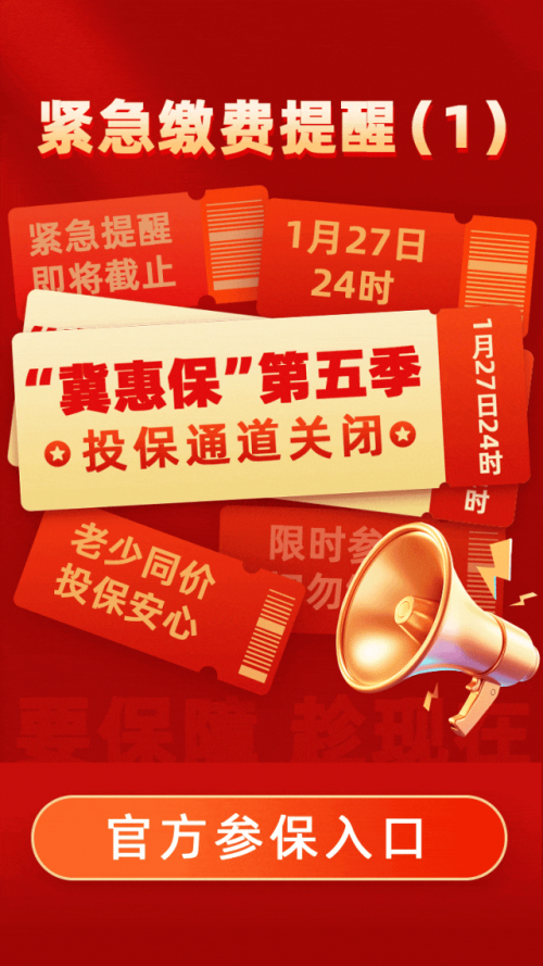 在此,我們再次提醒廣大居民朋友,1月27日24時參保通道將準(zhǔn)時關(guān)閉。健康是無價的財富,請您務(wù)必抓住最后幾天的時間,為全家投保“冀惠保”。更多保障詳情及理賠咨詢,請關(guān)注“冀惠保”官方微信公眾號。一年僅此一個繳費(fèi)期,如果您或身邊的朋友有需求,切勿錯過這寶貴的投保機(jī)會。