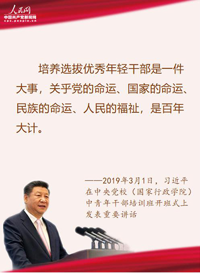 【編者按】2019年春季學期中央黨校(國家行政學院)中青年干部培訓班1日上午在中央黨校開班。習近平總書記在開班式上發(fā)表重要講話強調(diào),培養(yǎng)選拔優(yōu)秀年輕干部是一件大事,關乎黨的命運、國家的命運、民族的命運、人民的福祉,是百年大計。