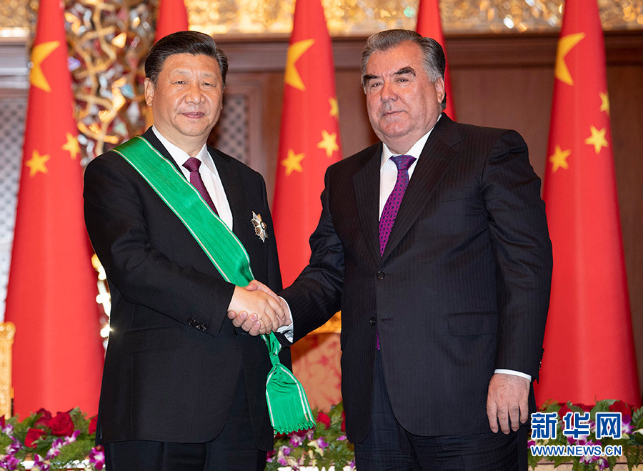 6月15日,國家主席習(xí)近平在杜尚別出席儀式,接受塔吉克斯坦總統(tǒng)拉赫蒙授予“王冠勛章”。 新華社記者 沙達(dá)提 攝