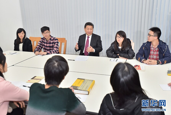 2014年12月20日下午,國家主席習(xí)近平來到澳門大學(xué)橫琴新校區(qū)考察。這是習(xí)近平在鄭裕彤住宿式書院參與學(xué)生舉辦的“中華傳統(tǒng)文化與當(dāng)代青年”主題沙龍。新華社記者 李濤攝