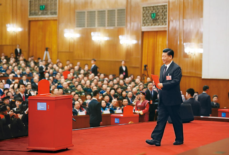 2018年3月17日,十三屆全國人大一次會議在北京人民大會堂舉行第五次全體會議。習近平當選中華人民共和國主席、中華人民共和國中央軍事委員會主席。這是習近平準備投票。 新華社記者 蘭紅光/攝
