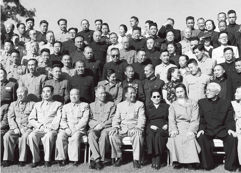 中華人民共和國第一屆全國人民代表大會第一次會議全體代表于1954年9月21日合影。 毛澤東主席和代表們在一起。前排左起:董必武、周恩來、李濟深、劉少奇、毛澤東、宋慶齡、張瀾、林伯渠。 新華社稿 侯波/攝