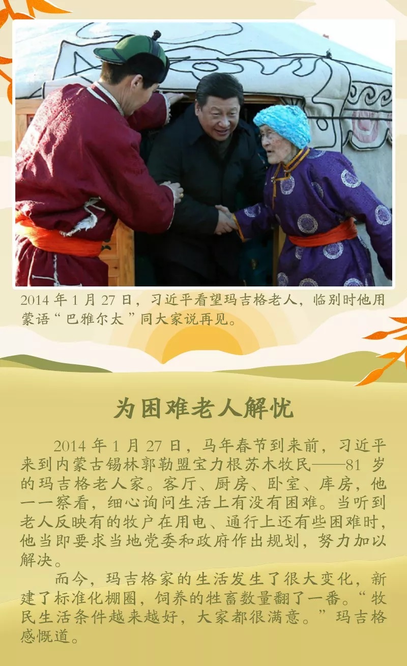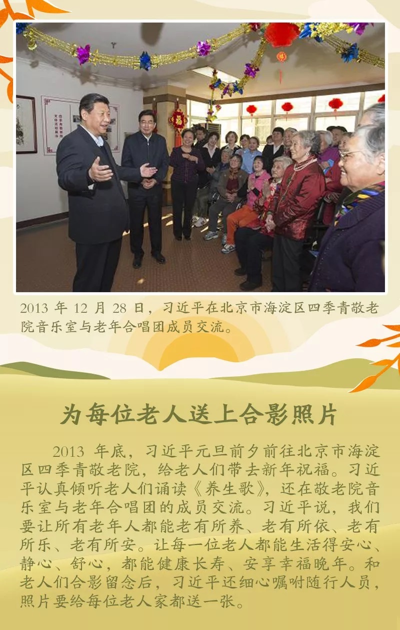 由小家而大家,由父母而天下老人。2016年5月29日,習(xí)總書記在參加中共中央政治局第三十二次集體學(xué)習(xí)時(shí)強(qiáng)調(diào),要推動(dòng)老齡事業(yè)全面協(xié)調(diào)可持續(xù)發(fā)展,要把弘揚(yáng)孝親敬老納入社會(huì)主義核心價(jià)值觀宣傳教育。尊老敬賢,習(xí)近平情意濃濃。