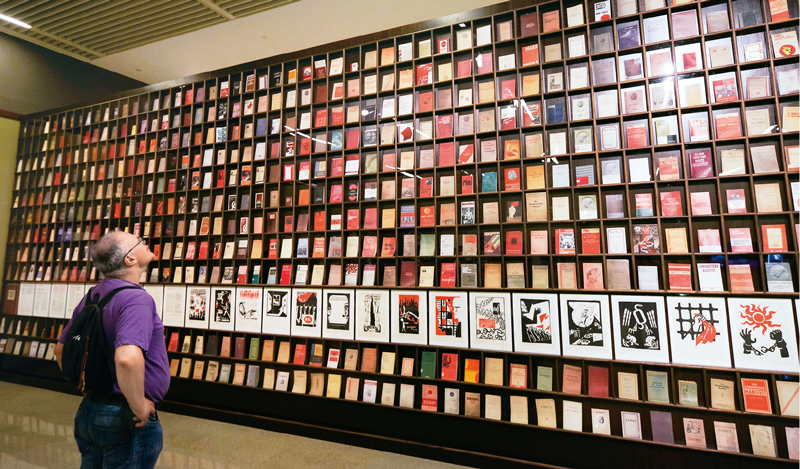 2018年5月9日,一位外國觀眾被北京“真理的力量——紀(jì)念馬克思誕辰200周年主題展覽”中一面展示不同國家出版的500多種《共產(chǎn)黨宣言》的書墻所吸引。 中新社記者 賈天勇/攝