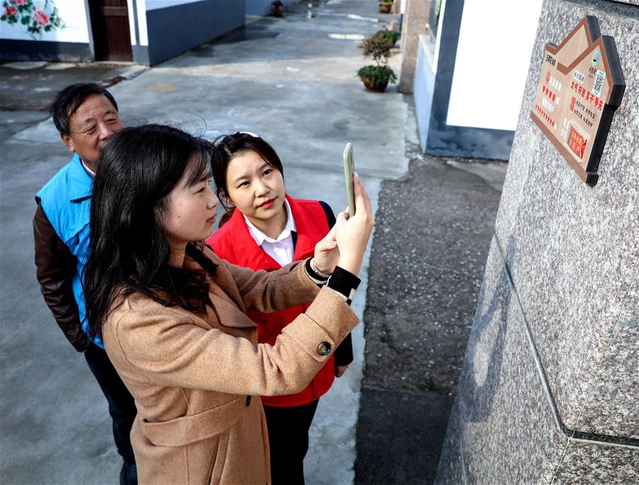 浙江省長興縣李家巷鎮(zhèn)劉家渡村村民(前)在黨員志愿者的指導(dǎo)下,用手機掃描二維碼(“村務(wù)e點通”),查看最新的文明誠信檔案考評結(jié)果(2019年11月28日攝)。 新華社記者 徐昱 攝