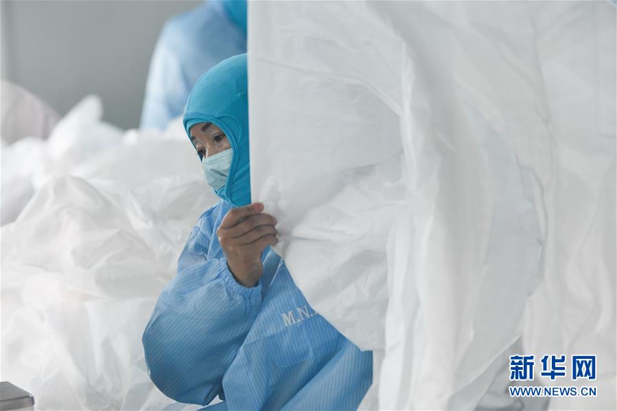 2月5日,在安徽莫尼克醫(yī)用材料有限公司,工作人員在趕制防護服。新華社記者張端攝