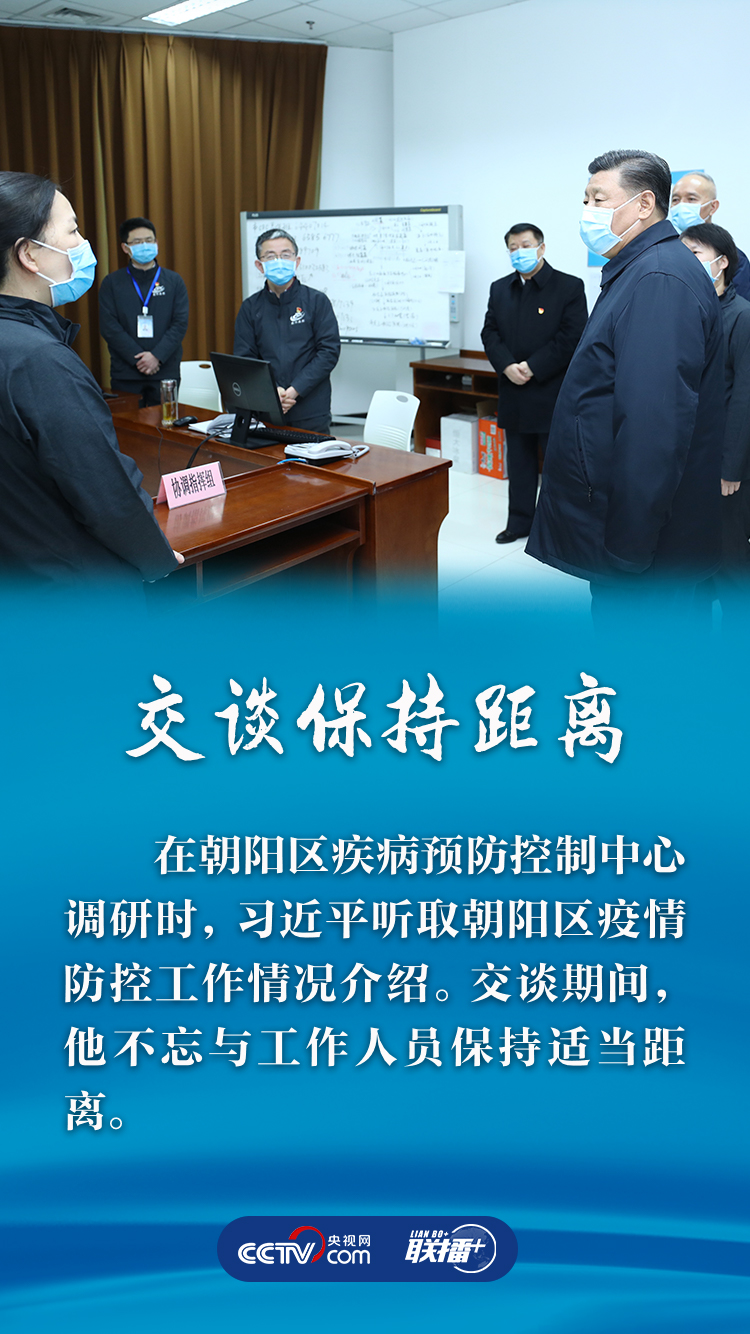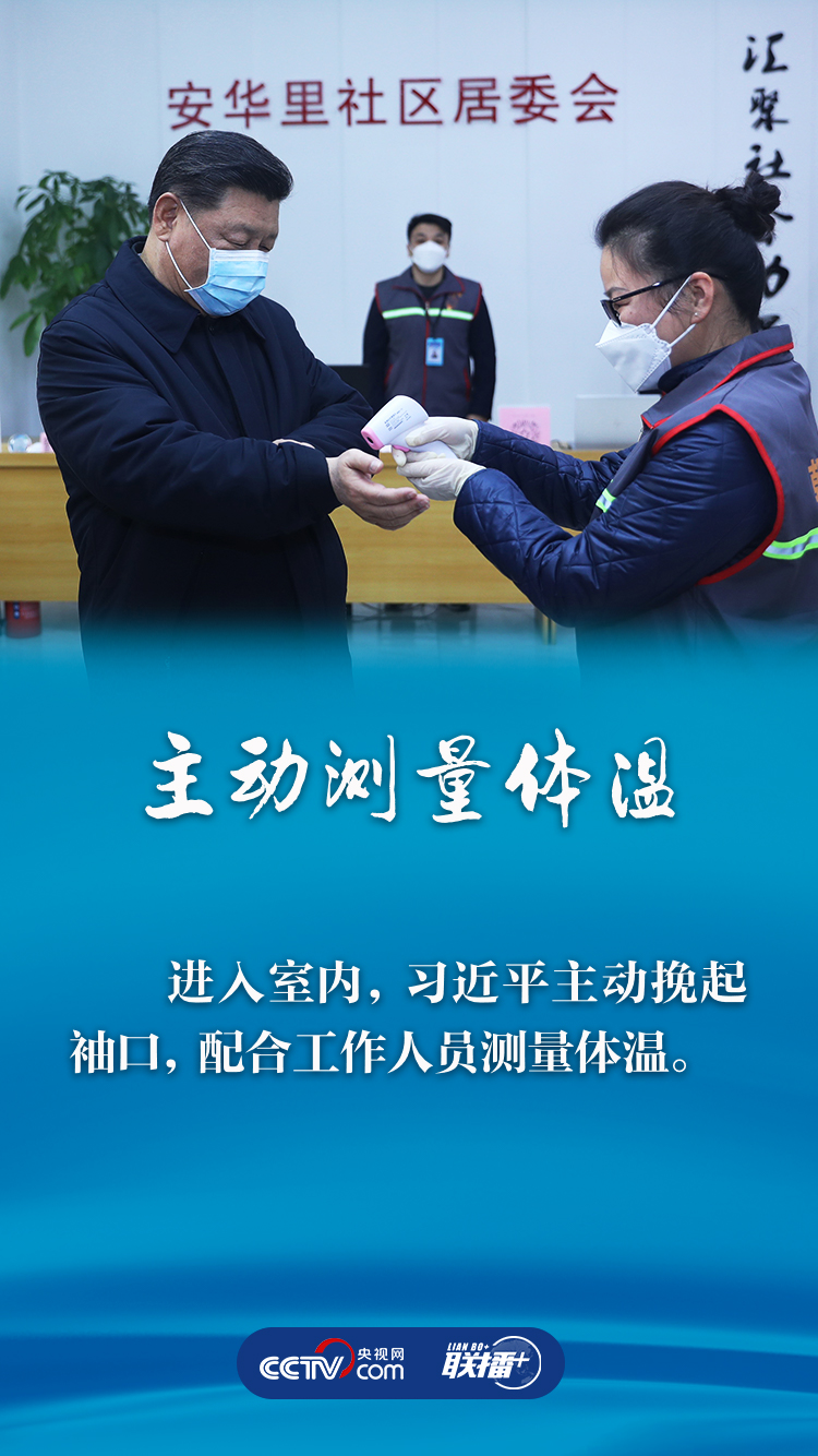 調(diào)研指導(dǎo)工作期間,習(xí)近平全程佩戴口罩,進(jìn)入室內(nèi)主動(dòng)測(cè)量體溫,與群眾暖心交流時(shí)不忘溫馨提醒“非常時(shí)期就不握手了”......他以身作則、帶頭做好疫情期間防護(hù),為百姓?qǐng)?jiān)持加強(qiáng)防護(hù)做好表率。