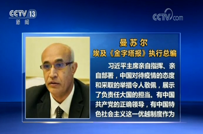 埃及《金字塔報(bào)》執(zhí)行總編曼蘇爾表示,習(xí)近平主席親自指揮、親自部署,中國對待疫情的態(tài)度和采取的舉措令人敬佩,展示了負(fù)責(zé)任大國的擔(dān)當(dāng)。有中國共產(chǎn)黨的正確領(lǐng)導(dǎo),有中國特色社會主義這一優(yōu)越制度作為保障,中國一定能戰(zhàn)勝疫情,贏得這場疫情防控阻擊戰(zhàn)的勝利。