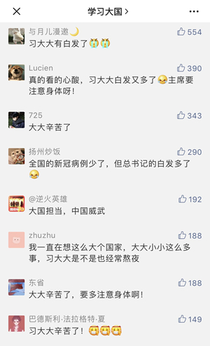 從新聞鏡頭中,有網(wǎng)友敏銳地關(guān)注到一個細(xì)節(jié):“全國新冠肺炎病例少了,總書記的白發(fā)卻多了”。很多人留言傾述自己的關(guān)切之情。