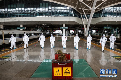 3月24日,消防員對武漢火車站站臺進(jìn)行全面消殺。