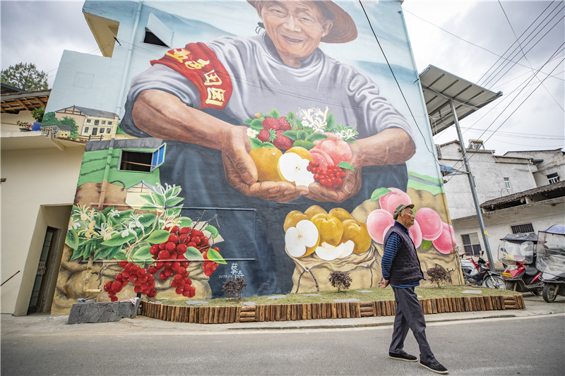 5月11日,重慶市巫溪縣通城鎮(zhèn)龍池村一位村民從一幅墻繪前走過(guò)。