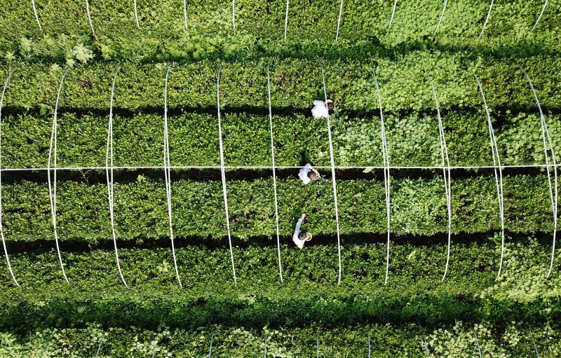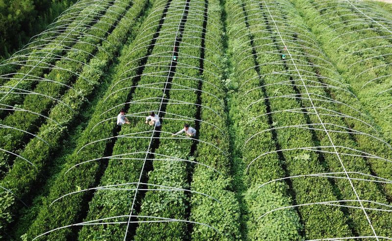 8月3日,在山東省泰安市岱岳區(qū)道朗鎮(zhèn),茶農(nóng)采摘夏茶(無人機照片)。
