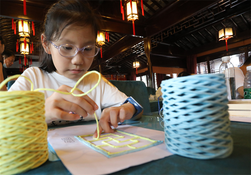 8月2日,在江蘇蘇州留園,一名孩子在體驗(yàn)手工花窗制作。新華社發(fā)(杭興微攝)