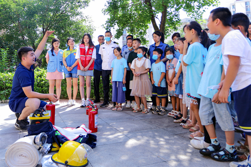 8月1日,在山東省青島西海岸新區(qū)泊里鎮(zhèn)社區(qū)社會(huì)組織創(chuàng)新發(fā)展基地,青年志愿者為兒童講解消防知識(shí)。新華社發(fā)(王培珂攝)