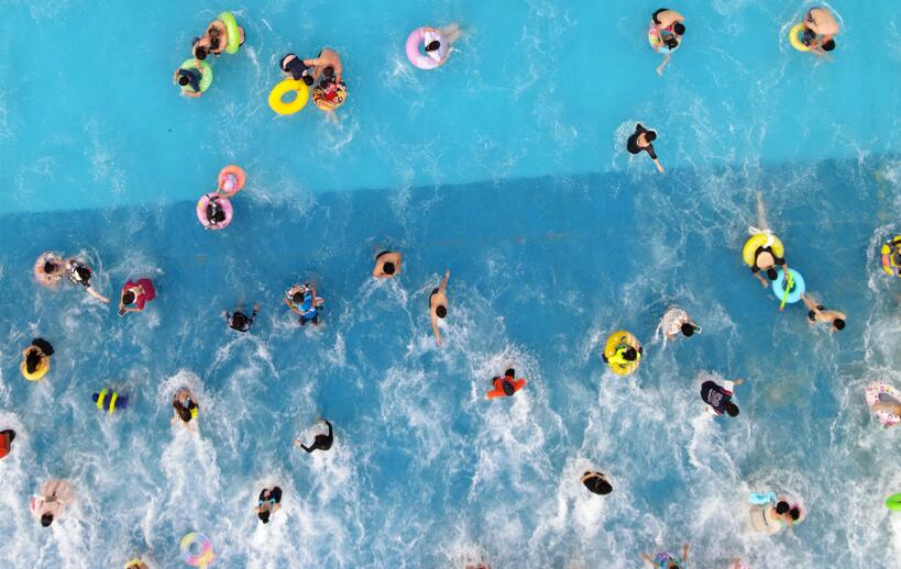 7月12日,在江蘇省揚州市水上樂園,游客在戲水納涼(無人機照片)。 新華社發(fā)(孟德龍攝)