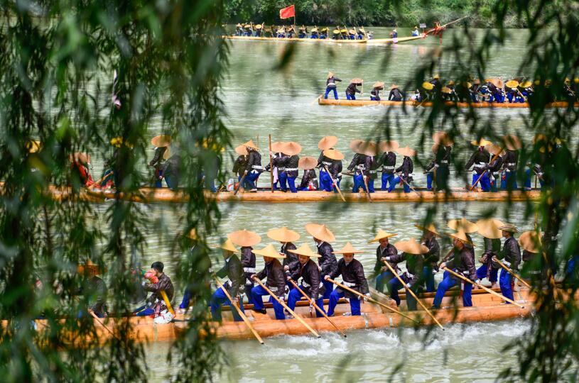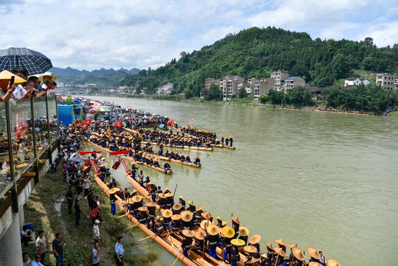 6月23日,苗族群眾在貴州省臺江縣施洞鎮(zhèn)清水江上匯集,準(zhǔn)備賽獨木龍舟。