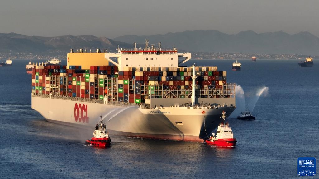 新華社雅典7月10日電(記者陳占杰)“東方比雷埃夫斯”號(hào)大型集裝箱船10日抵達(dá)希臘最大港口比雷埃夫斯。港方以“水門禮”歡迎這艘近400米長(zhǎng)的集裝箱船首航掛靠比港。