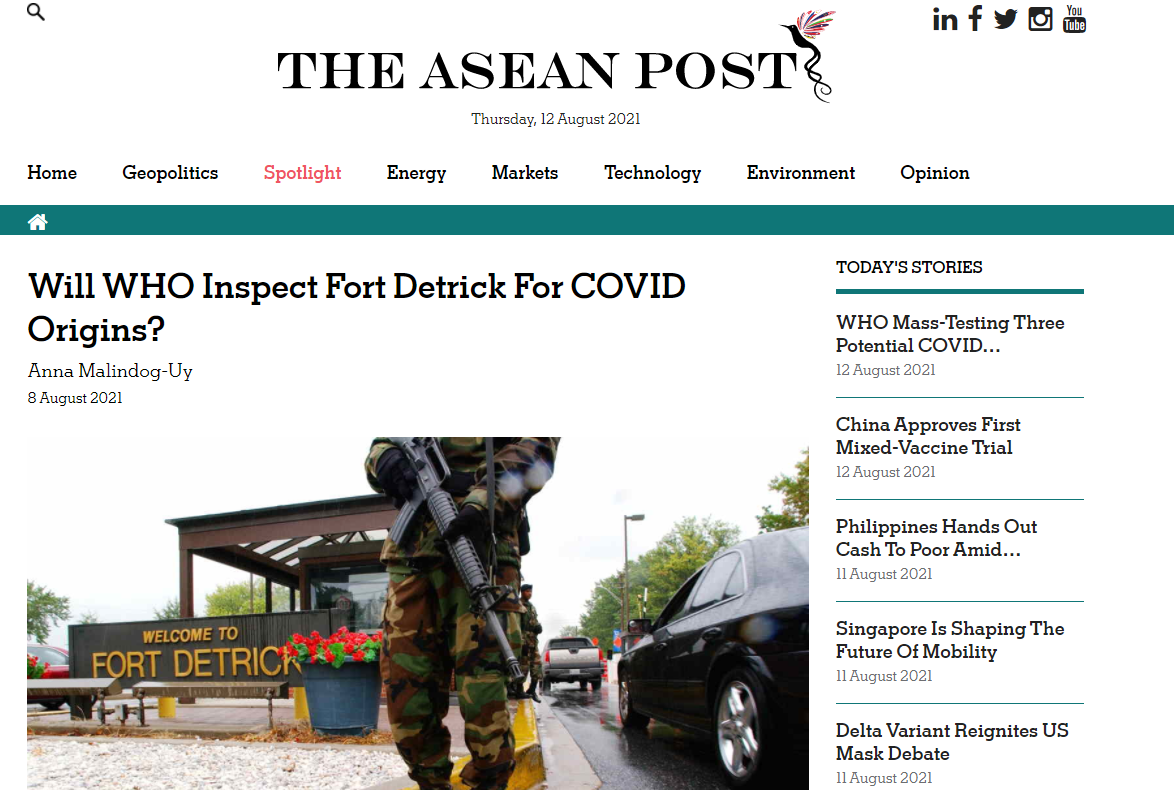 中國(guó)日?qǐng)?bào)網(wǎng)8月12日電 近來(lái),國(guó)際社會(huì)要求調(diào)查美國(guó)德特里克堡生物實(shí)驗(yàn)室的理性聲音不斷增多。馬來(lái)西亞《東盟郵報(bào)》網(wǎng)站近日刊發(fā)菲律賓政治學(xué)家Anna Malindog-Uy的評(píng)論文章稱,了解新型冠狀病毒的起源是一個(gè)非常重要的問(wèn)題和任務(wù),美國(guó)德特里克堡實(shí)驗(yàn)室是一個(gè)不應(yīng)被世衛(wèi)組織忽視的謎團(tuán)。