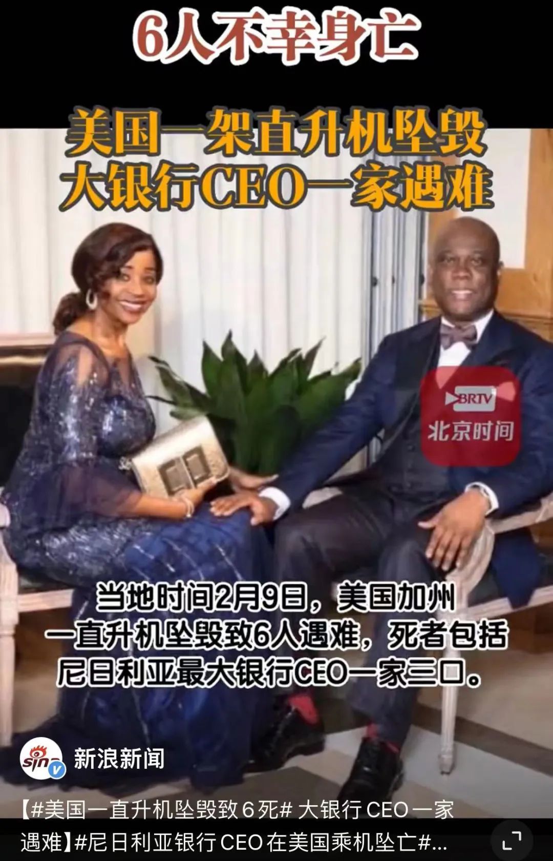 據(jù)報道,該直升機(jī)的乘客中包括尼日利亞資產(chǎn)規(guī)模最大的銀行——Access銀行的聯(lián)合創(chuàng)始人赫伯特·維格(Herbert Wigwe),以及他的妻兒。他們準(zhǔn)備飛往拉斯維加斯,觀看本周日的超級碗比賽(美國國家橄欖球聯(lián)盟NFL的年度冠軍賽)。當(dāng)天為雨雪天氣,事故原因正在調(diào)查中。