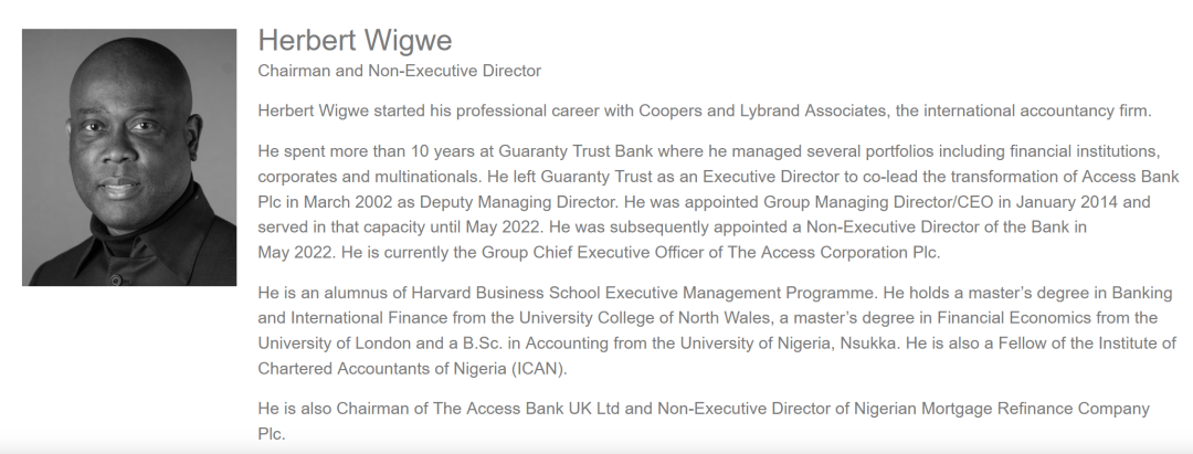 2002年3月,赫伯特·維格作為Access Bank的副總經(jīng)理共同領(lǐng)導(dǎo)了Access Bank Plc的轉(zhuǎn)型。他于2014年1月1日被任命為集團(tuán)總經(jīng)理/首席執(zhí)行官,一直在該集團(tuán)服務(wù)至2022年5月。隨后,他于2022年5月被任命為該銀行的非執(zhí)行董事。