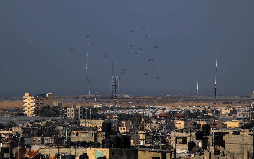 這是2月27日拍攝的向加沙地帶空投的救援物資。約旦武裝部隊(duì)27日發(fā)表聲明說(shuō),約旦皇家空軍當(dāng)天向巴勒斯坦加沙地帶空投了一批救援物資。聲明說(shuō),3架約旦皇家空軍的飛機(jī)和3架分別來(lái)自阿拉伯聯(lián)合酋長(zhǎng)國(guó)、埃及和法國(guó)的飛機(jī)當(dāng)天從位于約旦首都安曼的阿卜杜拉二世空軍基地起飛,執(zhí)行向加沙地帶空投救援物資和食品的任務(wù)。新華社發(fā)(亞西爾·庫(kù)迪攝)
