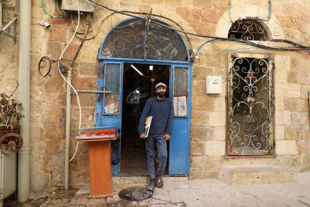 2月26日,拉米·納布爾西在耶路撒冷老城的自家銀器店外留影。新華社發(fā)(賈馬爾·阿瓦德攝)