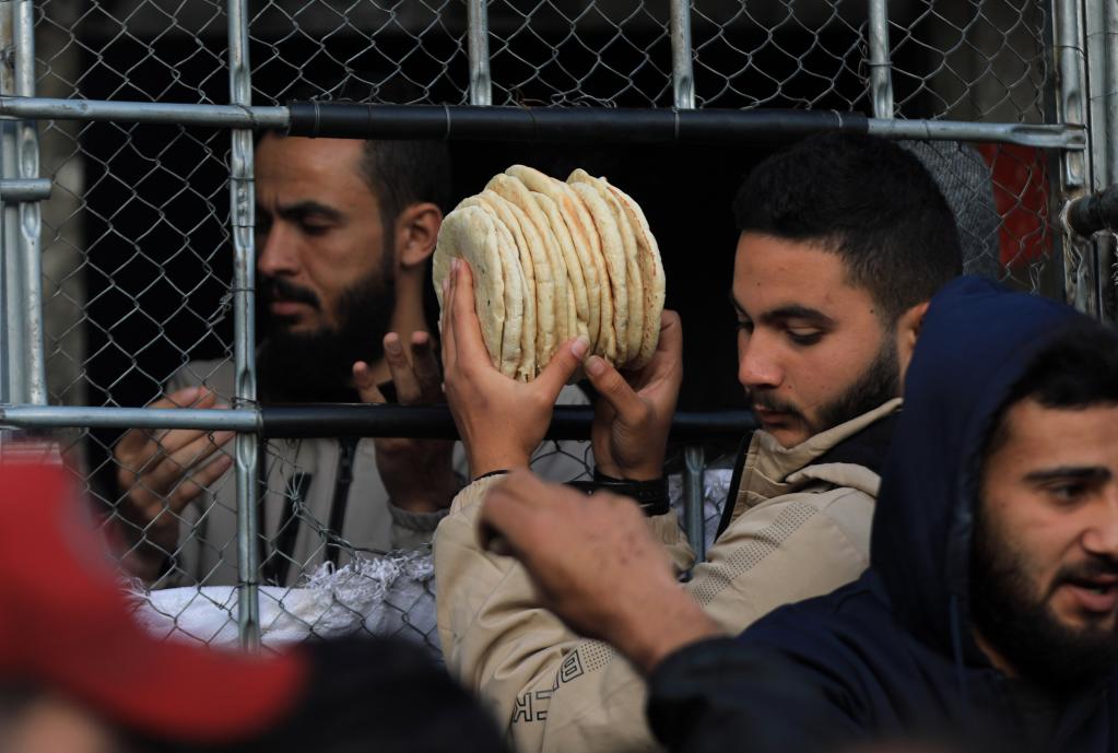 2月27日,在加沙地帶北部的杰巴利耶難民營,人們領(lǐng)取食物。新華社發(fā)(穆罕默德·阿里攝)