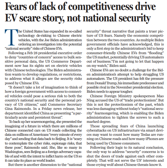 原標(biāo)題:Fears of lack of competitiveness drive EV scare story, not national security