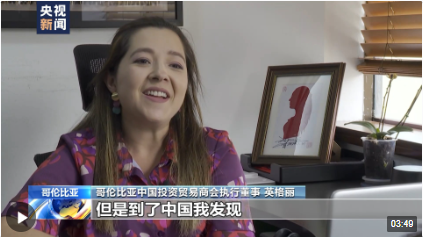 哥倫比亞中國投資貿(mào)易商會執(zhí)行董事 英格麗:我的老公是在中國認(rèn)識的,是哥倫比亞人。他也會說中文,我們現(xiàn)在都是在從事和中國企業(yè)有關(guān)的工作,這個是中國給我們最大的機(jī)會。非常感謝中國。我們兩個人的工作都和中國有關(guān)系,所以我們會關(guān)注中國企業(yè)在哥倫比亞可以處理發(fā)展咱們的生意,比如說商會每一年有舉辦一個活動,叫中國哥倫比亞對話。這個活動的目的就是中國企業(yè)和哥倫比亞政府談一下他們的共同題目,比如說建設(shè)項(xiàng)目或者技術(shù)合作。