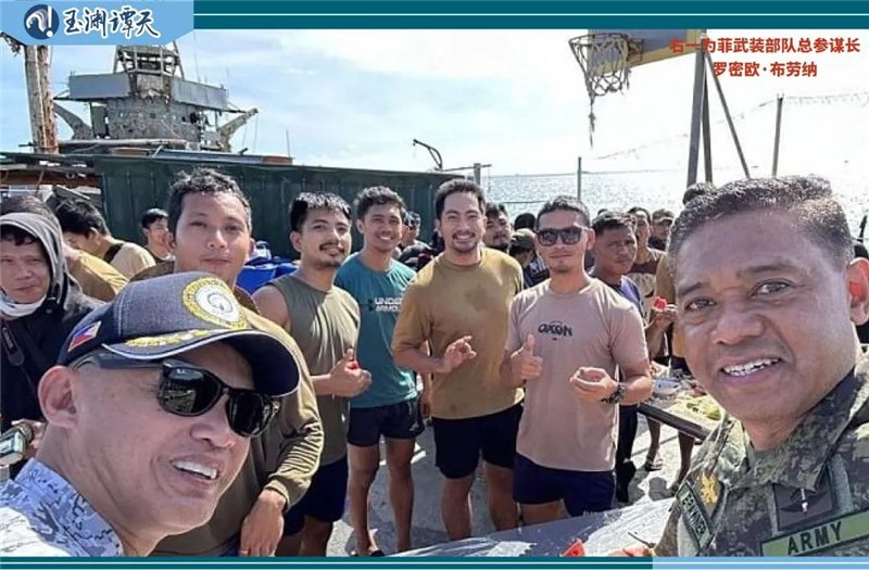 而菲武裝部隊(duì)的總參謀長,就藏在這條運(yùn)送生活物資的船上。在混上非法“坐灘”軍艦后,這位總參謀長拍了一張照片,而菲律賓媒體對(duì)這張圖進(jìn)行了大肆炒作,稱總參謀長“視察”了自己的部隊(duì)。