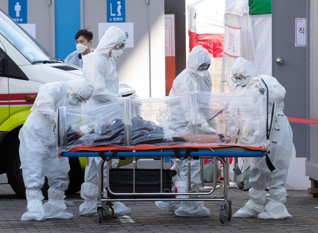 2020年3月11日,在韓國首爾,醫(yī)護人員將一名患者從救護車轉送至醫(yī)院。新華社發(fā)(李相浩攝)